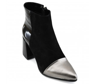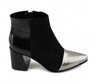 Botineta de cuero combinado: charol, gamuza y metalizado. Caña baja con cierre lateral. Fondo en suela y taco forrado.