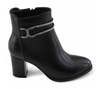 Botineta de material sintético combinado liso y simil croco. Caña media baja con cierre lateral interno. Detalle de aplique tipo cinto en strass. Suela sintética con taco forrado. Altura de taco: 7,5 cm Altura de la plataforma: 1cm Peso por pie: 335 grs Horma:normal en largo y ancho