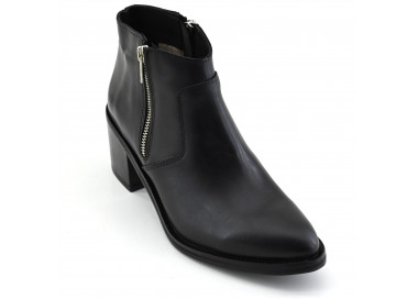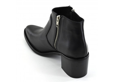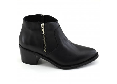 Botineta de cuero de caña baja con doble cierre. Base sintética con taco foliado.