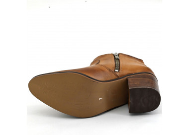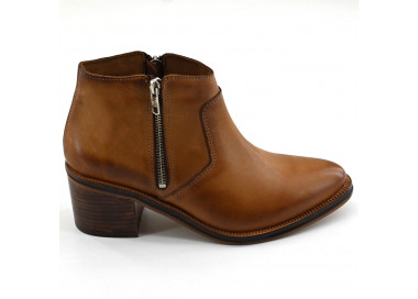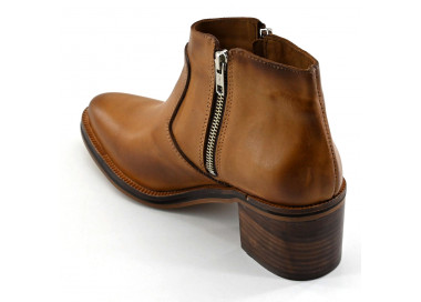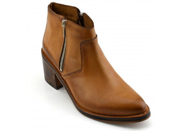 Botineta de cuero. Caña corta y acceso mediante cierre lateral. Fondo en suela y taco forrado con suelín sintético.