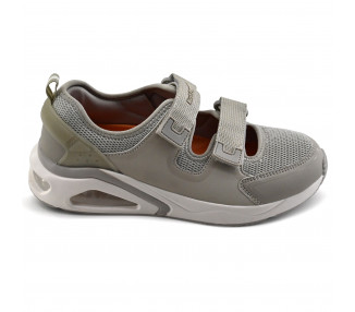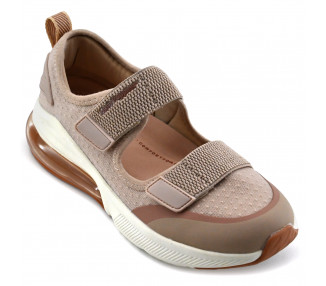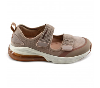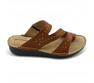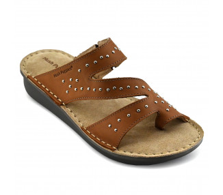 Zueco de tiras entrelazadas y puntera descubierta. Capellada de cuero mate y texturado. Fondo en suela de goma con taco chato.