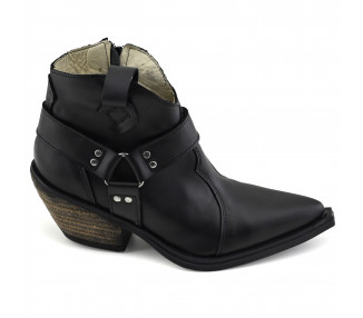Botineta en cuero graneado con detalle de diseño grabado, costura y tachas. Caña baja ceñida con cierre lateral. Suela plataforma chata sintética con taco folia.