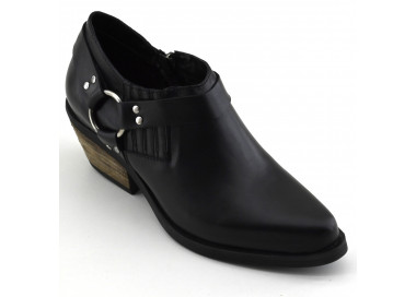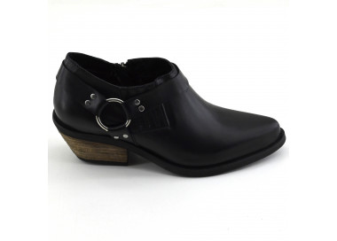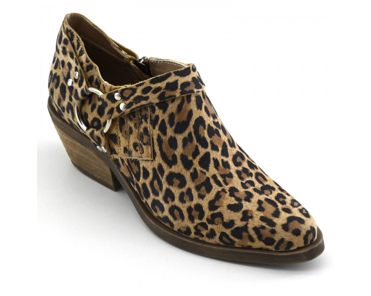 Charrito de cuero combinado con gamuza y detalle de tachas sectorizado. Caña corta con cierres laterales metálicos. Suela rústica con taco medio-bajo foliado.