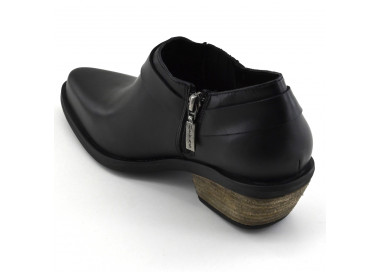 Charrito confeccionado en cuero graneado metalizado. Caña corta con piezas elastizadas en laterales. Suela y bases sintéticas con taco foliado.