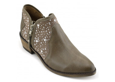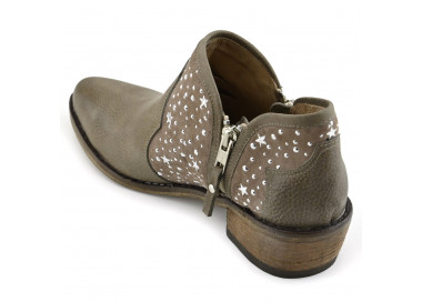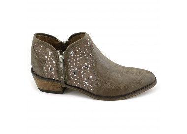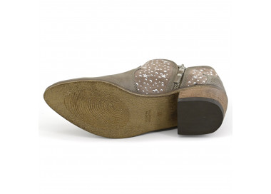 Charrito confeccionado en cuero graneado metalizado. Caña corta con piezas elastizadas en laterales. Suela y bases sintéticas con taco foliado.