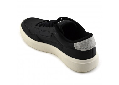 Zapatilla Court capellada de cuero. Cordones planos. Forrería textil.