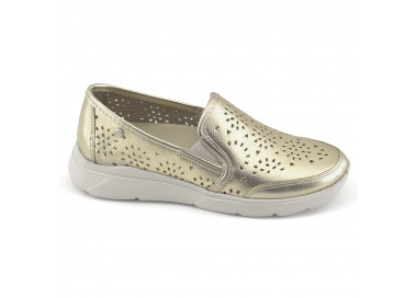 Mocasín de cuero metalizado. Suela plataforma sintética dentada con taco.