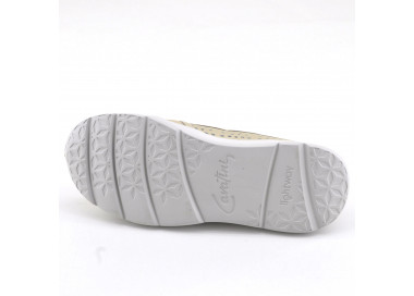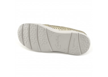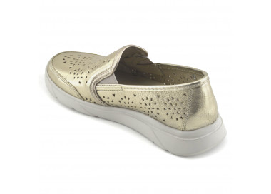 Zapato mocasin de cuero sintético metalizado. Detalle de flecos y aplique sobre empeine. Suela sintética con taco chato.