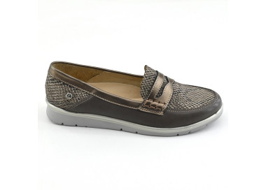 Zapato cerrado de cuero estilo mocasín. Suela sintética con taco bajo forrado.