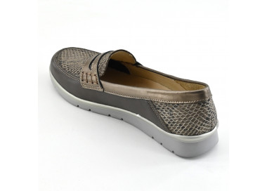 Mocasín de mujer de cuero quebrado metalizado. Capellada con diseño calado y costuras vistosas. Fondo sintético.