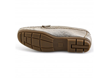 Zapato mocasin de cuero sintético metalizado. Detalle de flecos y aplique sobre empeine. Suela sintética con taco chato.