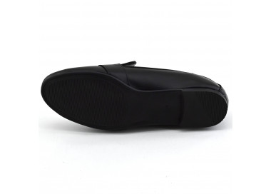 Zapato mocasin de cuero sintético. Detalle de flecos y aplique sobre empeine. Suela sintética con taco chato.