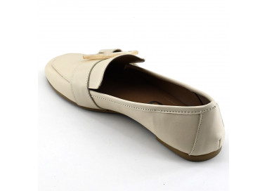 Zapato mocasin de cuero sintético metalizado. Detalle de flecos y aplique sobre empeine. Suela sintética con taco chato.
