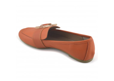 Zapato mocasin de cuero sintético. Detalle de flecos y aplique sobre empeine. Suela sintética con taco chato.