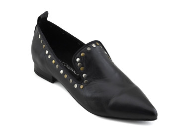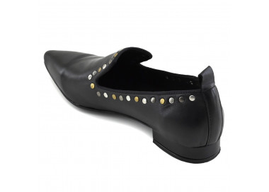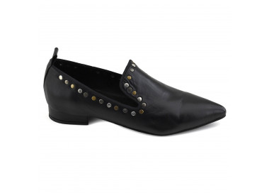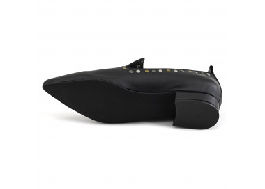 Mocasín en punta confeccionado en charol. Detalle de aplique circular con pieza metálica sobre empeine-puntera. Base en suela con taco chato en forma de corazón.
