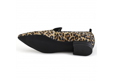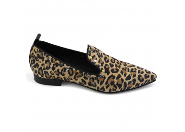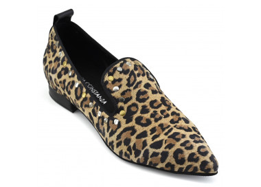 El mocasín flat Roxi es una combinación de estilo clásico y casual, con detalles distintivos como el pelo de leopardo y el herraje de marca SD en oro. La suela de cuero vacuno añade un toque de calidad y durabilidad. Taco foliado de 2 cm de altura.