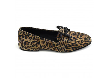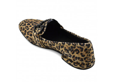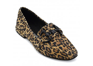 Mocasín chato de cuero con detalle de cinto y aplique de estribo con piedras al tono.