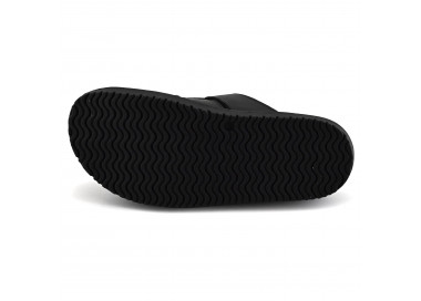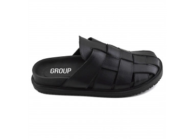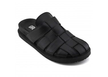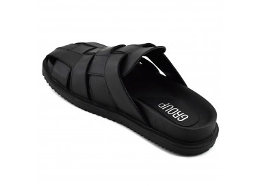 Zueco de talón descubierto y capellada de fajas entrelazadas.