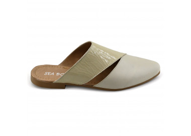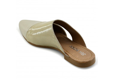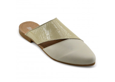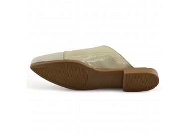 Zueco de cuero y charol quebrado.