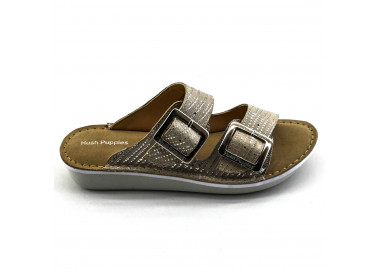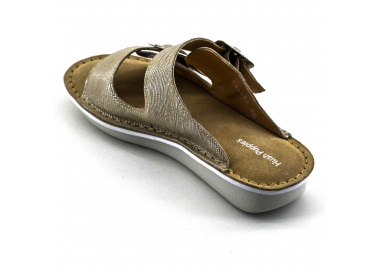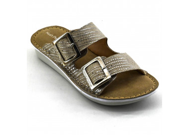 Zueco chato con faja croco en cuero y hebilla carey. Suela sintética baja con taco chato.