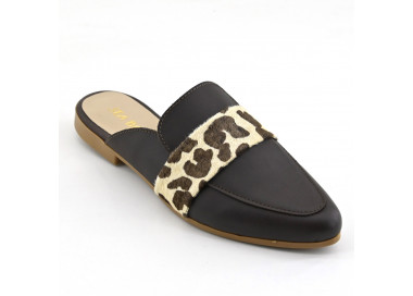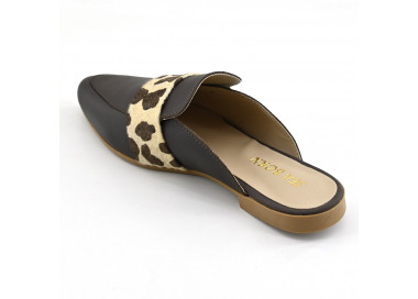 Zueco con plataforma tipo gomón. Confeccionado en cuero y pelo con estampa de manchas. Fondo de plataforma sintética en goma.