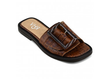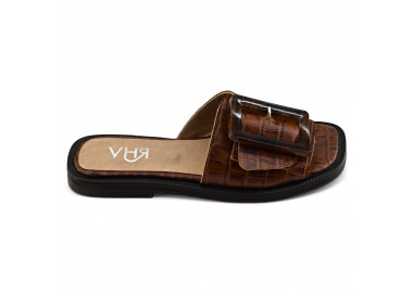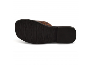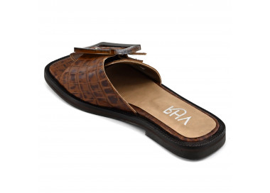 Zueco con plataforma tipo gomón. Confeccionado en cuero y pelo con estampa de manchas. Fondo de plataforma sintética en goma.