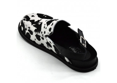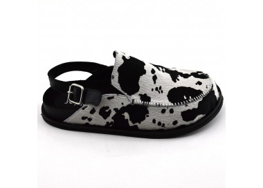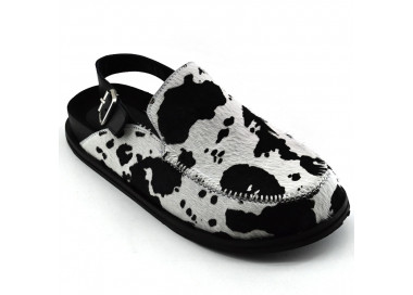 Zueco confeccionado en cuero quebrado. Detalle sobre empeine de faja con arandelas y pieza superpuesta con tachas en puntera. Fondo en base sintética con taco foliado.