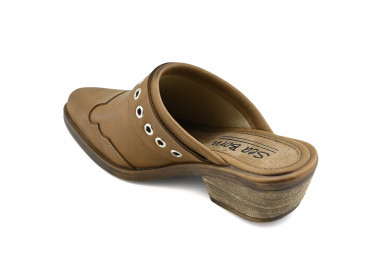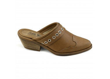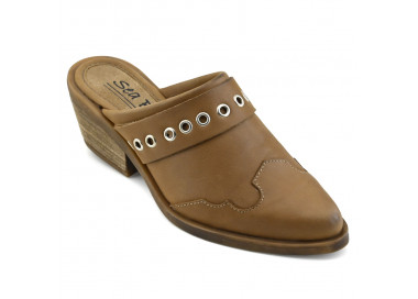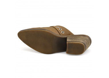 Detalle sobre empeine de faja con arandelas y pieza superpuesta con tachas en puntera.