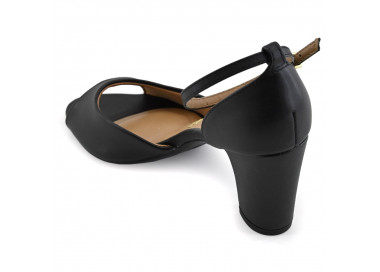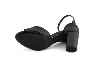 Sandalia de dos fajas en cuero. Faja más fina en talón con hebilla. Plataforma uniforme forrada y base de goma.