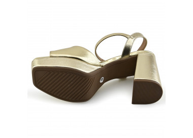 Sandalia metalizada de tiras acolchadas. Acceso y ajuste con hebilla mediante tiras cruzadas. Fondo de plataforma taco chino forrado en rafia. Suela sintética.