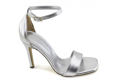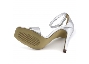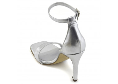Sandalia de estilo clásico en material tipo lurex. Puntera semiredonda con detalle metalizado en la base. Talonera y tira fina con pulsera. Taco cono forrado y suela sintética.