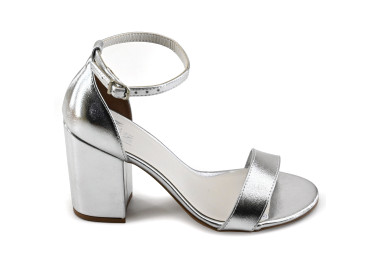 Sandalia de estilo clásico en material tipo lurex. Puntera semiredonda con detalle metalizado en la base. Talonera y tira fina con pulsera. Taco cono forrado y suela sintética.