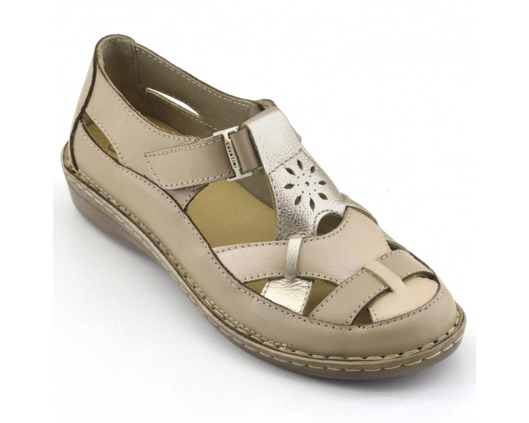 Sandalia metalizada de tiras acolchadas. Acceso y ajuste con hebilla mediante tiras cruzadas. Fondo de plataforma taco chino forrado en rafia. Suela sintética.