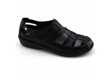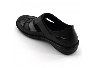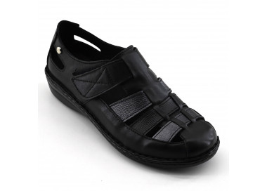 Sandalia de plataforma y talón descubierto. Acceso y ajuste mediante tiras con hebilla. Puntera semi cuadrada con fajas en cruz. Plataforma y taco ancho forrados con base sintética.