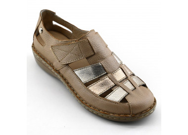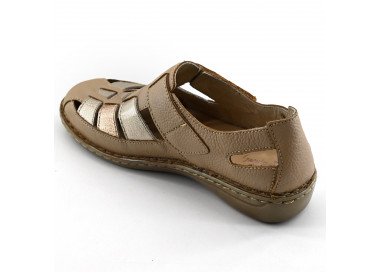 Sandalia de veraneo con suela de goma. Acceso y ajuste mediante fajas con velcro. Motivo estampado.
