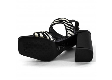 Sandalia metalizada con plataforma. Capellada de piezas delanteras con transparencia. Acceso con hebilla en pulsera y base plataforma forrada con taco alto cuadrado.