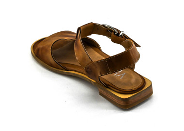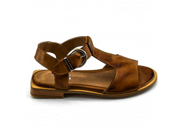 Sandalia de cuero metalizado con velcro y suela de goma.