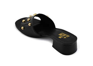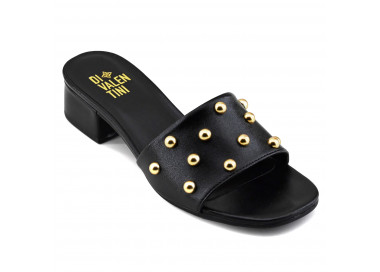 Sandalia de cuero con tiras finas y tachas. Suela plataforma sintética con taco ancho cuadrado.