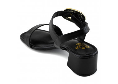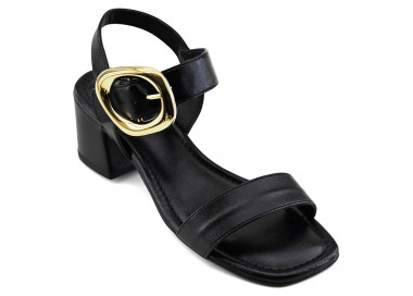 Sandalia de puntera y taco cuadrados. Talonera y tira pulsera con hebilla. Base en suela sintética con taco alto forrado de base cuadrada.