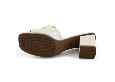 Sandalia de una faja en charol quebrado. Plataforma y taco vainilla forrados. Base en suela y suelín sintético.