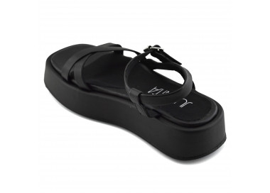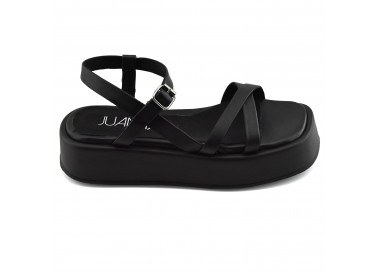 Sandalia de gamuza y tiras con strass. Acceso y ajuste con hebilla en pulsera. Taco vainilla forrado y suela.