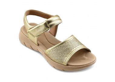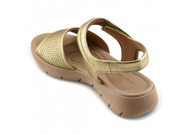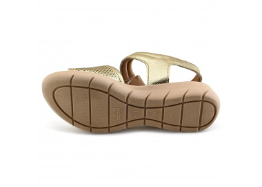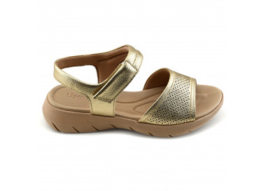 Sandalia de cuero metalizado con velcro y suela de goma.