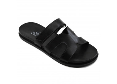 Sandalia de dos fajas en cuero. Faja más fina en talón con hebilla. Plataforma uniforme forrada y base de goma.