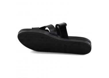 Sandalia estilo zueco con dos fajas y aplique central en piedra. Realizado en materiales sintéticos. Taco medio forrado y suela sintética.