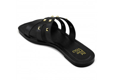 Sandalia alta con plataforma en rafia. Capellada de cuero con tiras con tachas. Faja delantera con logo de la marca en cuero cosido.