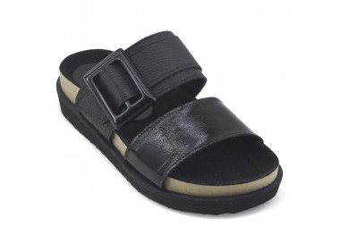 Sandalia de cuero mate y semi charol. Detalle de aplique tipo broche sobre capellada. Acceso y ajuste mediante pulsera con hebilla. Plataforma y taco cuadrado forrado con suelín sintético. Fondo en suela.