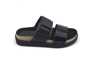 Sandalia de cuero con faja amplia. Pulsera tobillera ancha con hebilla. Suela plataforma con base de goma.