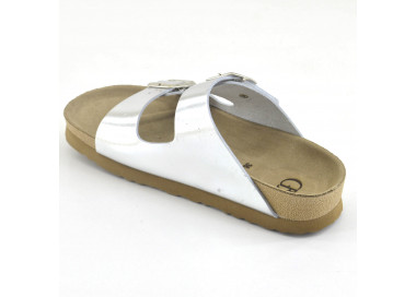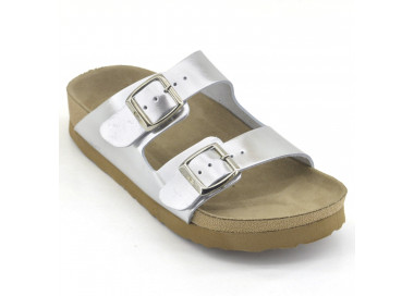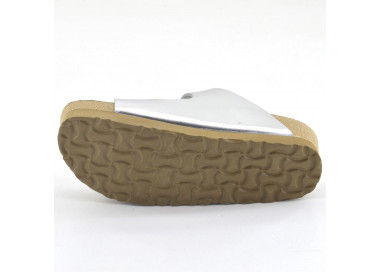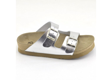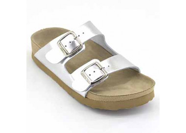 Sandalia metalizada de tres tiras con hebilla. Pulsera fina con hebilla y talón descubierto. Suela y taco forrado.