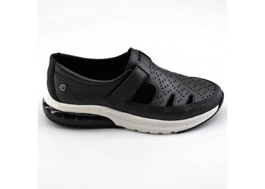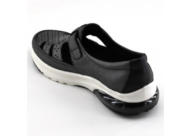 Sandalia de cuero charolado y base de goma. Capellada de faja principal y faja pulsera con abrojo. Plantilla confortable de goma con plataforma.