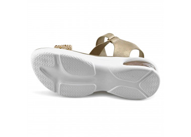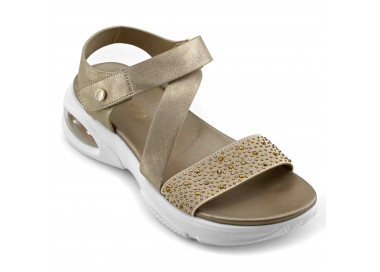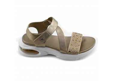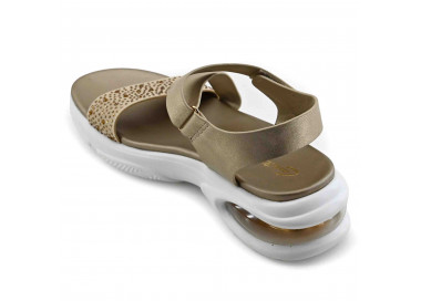 Sandalia Metz, de mujer, confeccionada en cuero y textil fantasía con strass, con diseño moderno y cámara de aire visible, pensada para brindar estilo, confort y un toque de brillo.